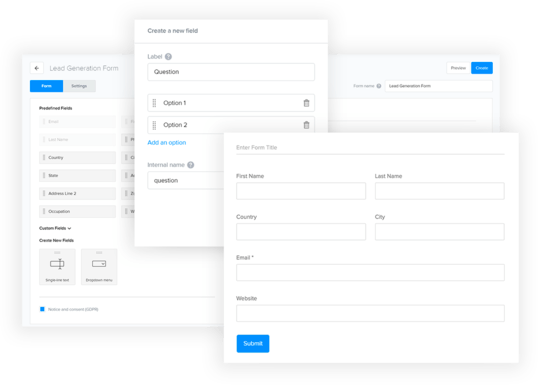 Use our drag and drop form builder to easily create online forms that represent your brand and are compliant with data collection laws. Embed or sharethem everywhere, collect information and get the real‐time results organized and stored in your CRM.